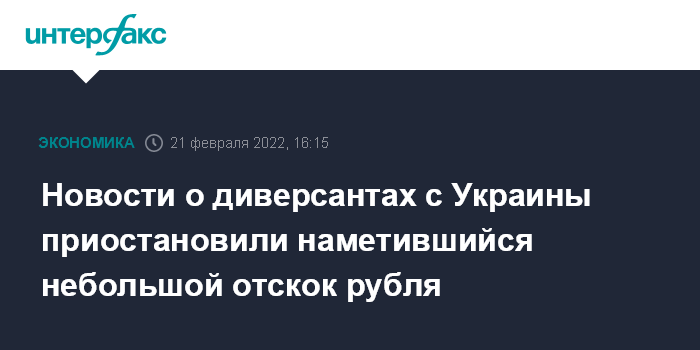 Москва. 21 февраля. INTERFAX.RU - Наметившийся в середине торгов в понедельник небольшой отскок российского рубля и акций после обвала в первой половине дня приостановился на новостях об уничтожении российскими военными диверсантов с Украины.