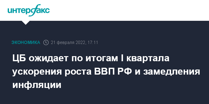 Москва. 21 февраля. INTERFAX.RU - ЦБ ожидает ускорение роста ВВП РФ в I квартале 2022 года до 5,5% (с 5,0% в IV квартале 2021 года), говорится в докладе о денежно-кредитной политике (ДКП) Банка России.