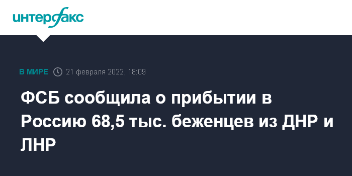 Москва. 21 февраля. INTERFAX.RU - В Россию из Донецкой и Луганской народных республик въехали 68,5 тысяч граждан, сообщил в понедельник директор ФСБ РФ Александр Бортников.
