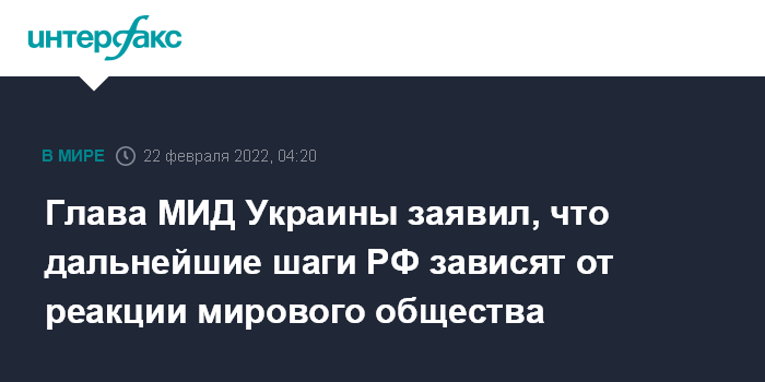 Москва. 22 февраля. INTERFAX.RU - Министр иностранных дел Украины Дмитрий Кулеба заявил, что от реакции мирового общества и от введения санкций против Российской Федерации зависят дальнейшие ее шаги.