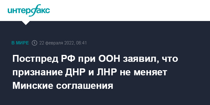 Москва. 22 февраля. INTERFAX.RU - Постпред РФ при ООН Василий Небензя заявил, что признание Россией независимости самопровозглашенных Луганской и Донецкой народных республик никак не отражается на Минских соглашениях.