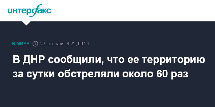 Москва. 22 февраля. INTERFAX.RU - Более 59 обстрелов ДНР зафиксированы за прошлые сутки, сообщает представительство Донецкой народной республики в совместном центре контроля и координации режима прекращения огня (СЦКК).