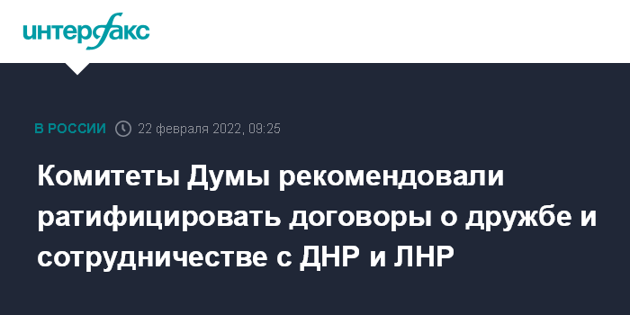 Москва. 22 февраля. INTERFAX.RU - Комитеты Госдумы по международным делам и по делам СНГ, евразийской интеграции и связям с соотечественниками на совместном заседании во вторник рекомендовали ратифицировать договоры о дружбе и сотрудничестве РФ с самопровозглашенными Донецкой и Луганской народными республиками.