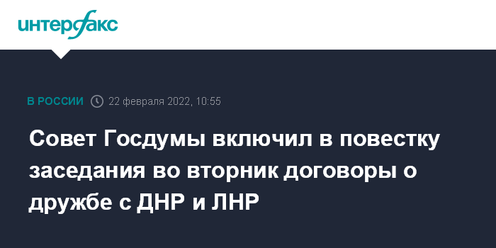 "Первыми двумя вопросами на заседание во вторник включили договор о дружбе с ДНР и договор о дружбе с ЛНР", - сказал Мельников "Интерфаксу" во вторник.