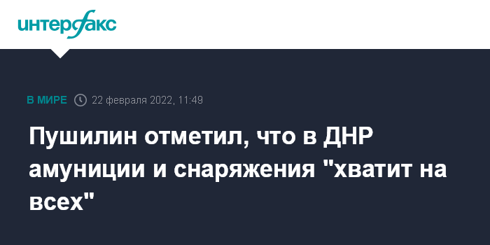 Москва. 22 февраля. INTERFAX.RU - В Донецкой народной республике достаточно военной амуниции и вооружения, заявил в эфире Youtube-канала "Соловьев Live" ее руководитель Денис Пушилин, отвечая на соответствующий вопрос.