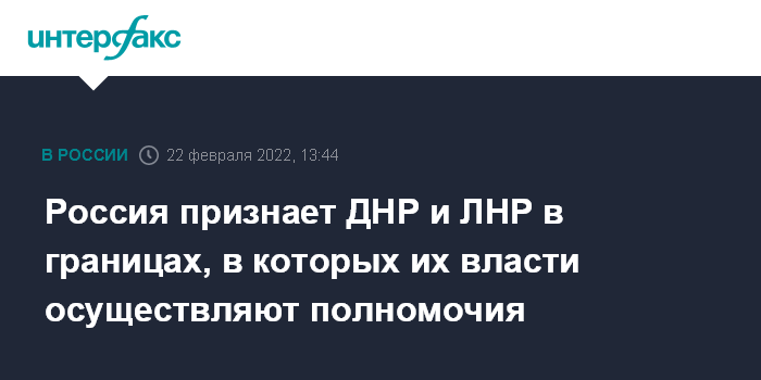 Россия признает ДНР и ЛНР в границах, в которых их власти осуществляют полномочия
