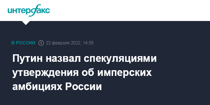 Москва. 22 февраля. INTERFAX.RU - Президент РФ Владимир Путин отверг звучащие на Западе обвинения в имперских амбициях России в связи с признанием независимости ДНР и ЛНР.
