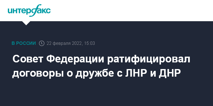 Москва. 22 февраля. INTERFAX.RU - Совет Федерации на заседании во вторник единогласно ратифицировал договоры о дружбе, сотрудничестве и взаимной помощи с Луганской и Донецкой народными республиками.