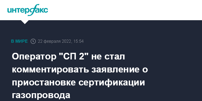 "Мы приняли к сведению сообщения СМИ о том, что бундесканцлер Шольц сегодня на пресс-конференции заявил о приостановке процедуры сертификации. Мы не можем комментировать эти сообщения и ожидаем надлежащую информацию от регулирующих органов", - ответили в NS 2 AG.