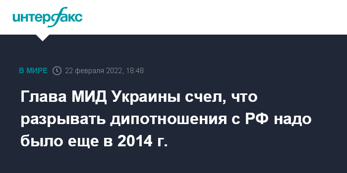 Москва. 22 февраля. INTERFAX.RU - Глава МИД Украины Дмитрий Кулеба сожалеет, что Киев не разорвал дипотношения с Москвой еще в 2014 году.