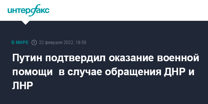Москва. 22 февраля. INTERFAX.RU - Россия будет исполнять взятые на себя обязательства по военной помощи ДНР и ЛНР, сообщил президент РФ Владимир Путин во вторник.