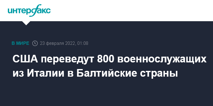 Москва. 23 февраля. INTERFAX.RU - США для укрепления восточного фланга НАТО переведут в Балтийские страны из Италии 800 военнослужащих, сообщил Пентагон после прозвучавшего во вторник заявления президента США Джо Байдена об усилении военного присутствия в регионе.