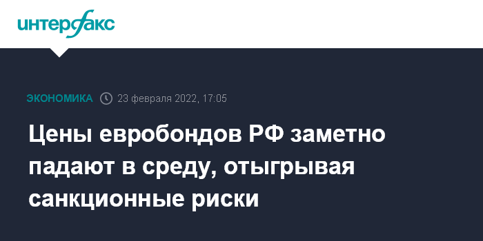 По мнению экспертов "Интерфакс-ЦЭА", резкое падение стоимости российских еврооблигаций связано, прежде всего, с возросшими санкционными рисками после признания Россией независимости ДНР и ЛНР. При этом на рынок давят как уже объявленные санкции, так и опасения их усиления в будущем в случае дальнейшего обострения ситуации вокруг Украины.