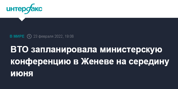 Москва. 23 февраля. INTERFAX.RU - Всемирная торговая организация (ВТО) приняла решение провести 12-ю министерскую конференцию в Женеве на неделе с 13 июня, говорится в ее сообщении по итогам прошедшего в среду генсовета.