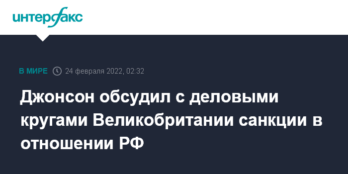 Москва. 24 февраля. INTERFAX.RU - Премьер-министр Великобритании Борис Джонсон встретился с ведущими городскими фирмами Великобритании, регулирующими органами и торговыми ассоциациями, чтобы обсудить первый пакет экономических санкций, вводимых против России.