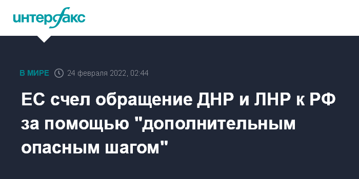 Москва. 24 февраля. INTERFAX.RU - Верховный представитель ЕС по иностранным делам и политике безопасности Жозеп Боррель заявил, что обращение ДНР и ЛНР за помощью России "поставит под угрозу тысячи жизней".