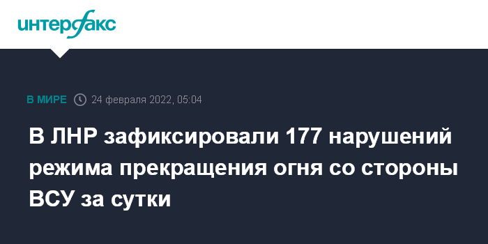 Москва. 24 февраля. INTERFAX.RU - Вооруженные силы Украины 177 раз за прошедшие сутки обстреляли территорию Луганской народной республики, сообщили "Интерфаксу" в представительстве ЛНР в Совместном центре по контролю и координации режима прекращения огня (СЦКК).