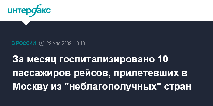 Москва. 29 мая. INTERFAX.RU - С введением в Москве комплекса мероприятий по недопущению завоза и распространения высокопатогенного гриппа A(H1N1) в аэропортах выявлено 10 пассажиров с повышенной температурой и симптомами гриппа, которые были немедленно госпитализированы, сообщили в пятницу "Интерфаксу" в территориальном управлении Роспотребнадзора,