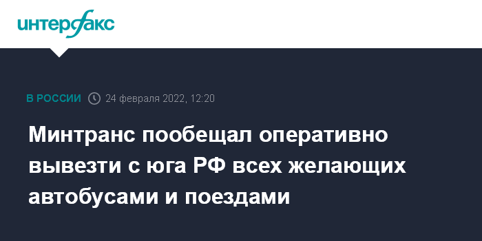 Москва. 24 февраля. INTERFAX.RU - Минтранс РФ создал оперативный штаб по организации работы транспортной отрасли на юге страны и обещает оперативный вывоз всех желающих железнодорожным и автобусным транспортом.