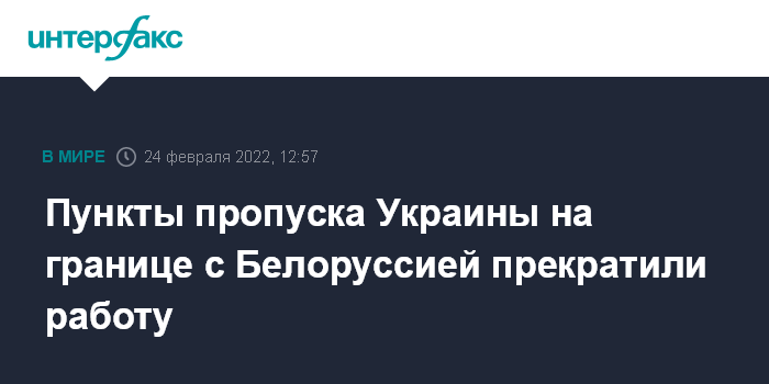 Москва. 24 февраля. INTERFAX.RU - Все пункты пропуска Украины на границе с Белоруссией приостановили свое функционирование на неопределенный срок, сообщили в Госпогранкомитете Белоруссии.