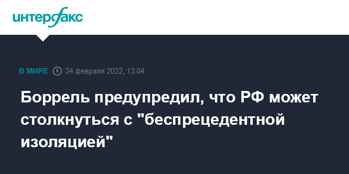 Москва. 24 февраля. INTERFAX.RU - Москва может столкнуться с "беспрецедентной изоляцией" в связи с военной операцией в Донбассе, заявил глава дипломатии ЕС Жозеп Боррель в четверг.