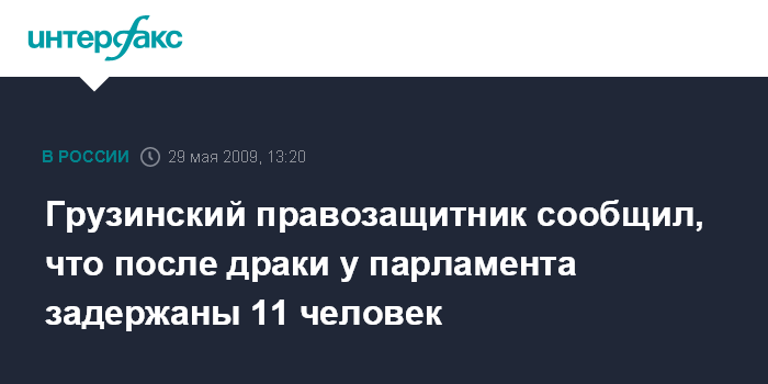 Москва. 29 мая. INTERFAX.RU - Представитель объединения грузинских неправительственных организаций "Общественный защитник" Нана Какабадзе заявила, что после произошедшего накануне инцидента перед зданием парламента Грузии полиция задержала 11 человек. Как сказала она в пятницу журналистам, пять человек были задержаны сразу после выписки из больницы, куда они были доставлены накануне. По ее информации, полицией задержаны еще шесть человек.
