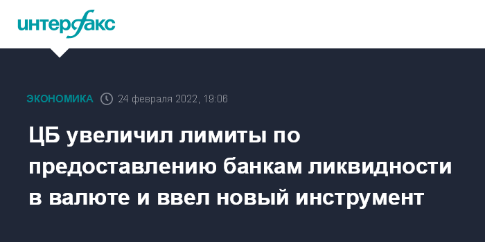 Москва. 24 февраля. INTERFAX.RU - ЦБ РФ увеличил лимиты по операциям предоставления банкам ликвидности в иностранной валюте, ввел новый инструмент, следует из сообщения регулятора.