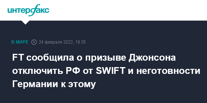 FT сообщила о призыве Джонсона отключить РФ от SWIFT и неготовности Германии к этому