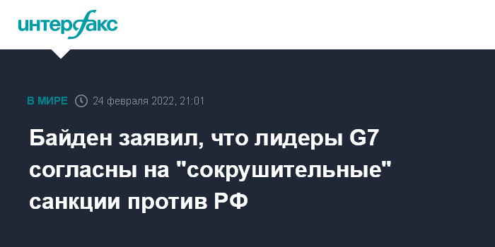 Москва. 24 февраля. INTERFAX.RU - Президент США Джо Байден по итогам встречи с лидерами G7 в четверг заявил, что союзники готовы ввести "сокрушительный" пакет санкций против России.