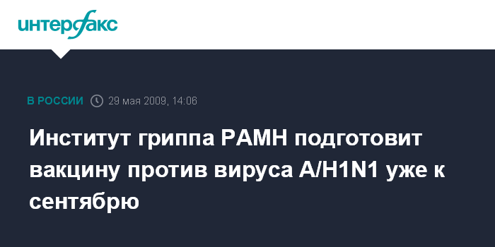Москва. 29 мая. INTERFAX.RU - Институт гриппа РАМН изготовит вакцину от вируса свиного гриппа (A/H1N1) к сентябрю текущего года. Заведующий лабораторией эволюционной изменяемости гриппа НИИ Михаил Еропкин рассказал журналистам в пятницу, что обычно такая вакцина производится за 7-8 месяцев, но в данной ситуации срок будет сокращен до 3 месяцев.