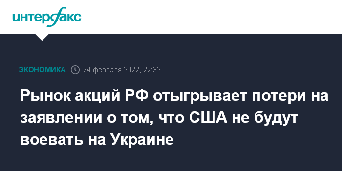 Москва. 24 февраля. INTERFAX.RU - Рынок акций РФ на вечерних торгах "Мосбиржи" начал отыгрывать колоссальные дневные потери после заявления президента США Джо Байдена, что войска США в Европе будут защищать НАТО, а не воевать на Украине.