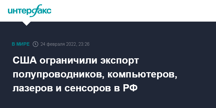 Москва. 24 февраля. INTERFAX.RU - Меры Вашингтона по экспортному контролю в отношении РФ коснутся полупроводников, компьютеров, лазеров и сенсоров, что повлияет на сферу обороны, аэрокосмическую отрасль и кораблестроение, говорится в заявлении Минторга США, опубликованном в четверг.