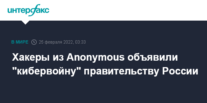 Москва. 25 февраля. INTERFAX.RU - Хакеры из группы Anonymous заявили, что проводят кибератаки на Россию. Они взяли ответственность за DDoS-атаку на RT.
