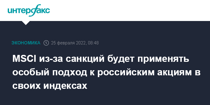 Москва. 25 февраля. INTERFAX.RU - MSCI начнет применять особый подход к российским акциям в своих индексах в связи с объявленными ранее санкциями США, говорится в сообщении индексного провайдера.