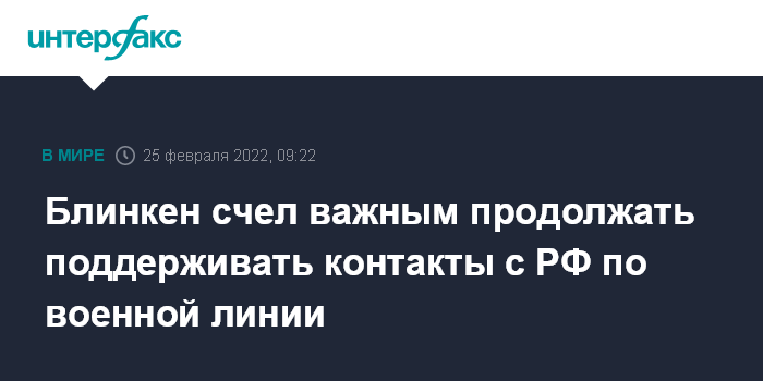 Москва. 25 февраля. INTERFAX.RU - Госсекретарь США Энтони Блинкен считает, что Россия должна представлять себе, каким рискам может подвергнуть себя в случае ошибок в расчетах, для этого необходимо поддержание контактов по военной линии.