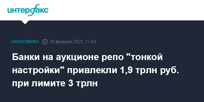 ЦБ в четверг сообщил о проведении 25 февраля аукциона репо "тонкой настройки" с лимитом 2 трлн рублей, утром в пятницу лимит был увеличен до 3 трлн рублей.