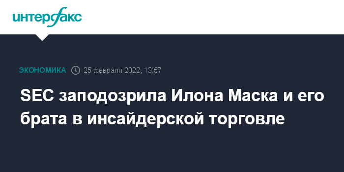 Москва. 25 февраля. INTERFAX.RU - Комиссия по ценным бумагам и биржам (SEC) США выясняет, является ли недавняя продажа бумаг Tesla Inc., которую осуществили главный исполнительный директор компании Илон Маск и его брат Кимбал Маск, нарушением правил инсайдерской торговли, пишет газета The Wall Street Journal со ссылкой на осведомленные источники.