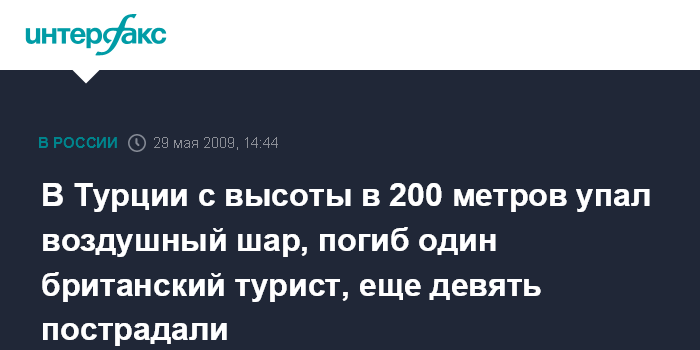 Москва. 29 мая. INTERFAX.RU - В результате падения воздушного шара с пассажирами на землю с высоты 200 метров погиб один турист из Великобритании, а еще девять получили ранения, сообщают в пятницу британские СМИ.