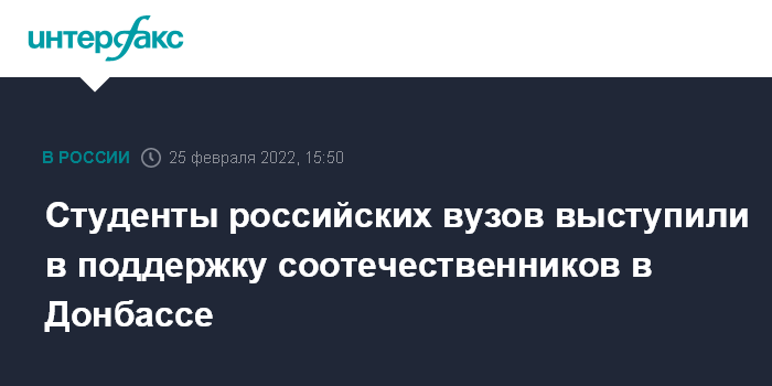 Москва. 25 февраля. INTERFAX.RU - Студенты российских вузов выступили в поддержку соотечественников в Донбассе и выразили готовность оказать помощь всем, кто пострадал в результате конфликта.