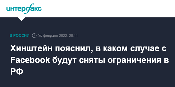 Москва. 25 февраля. INTERFAX.RU - Роскомнадзор снимет ограничение трафика к Facebook в РФ, если соцсеть снимет ограничения в отношении российских СМИ, сообщил глава IT-комитета Госдумы Александр Хинштейн.