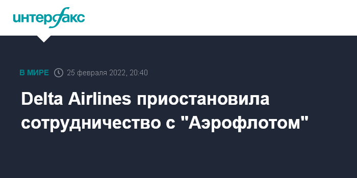 Москва. 25 февраля. INTERFAX.RU - Американская авиакомпания Delta Airlines приостановила действие соглашения о сотрудничестве с российским "Аэрофлотом", пишет Politico.