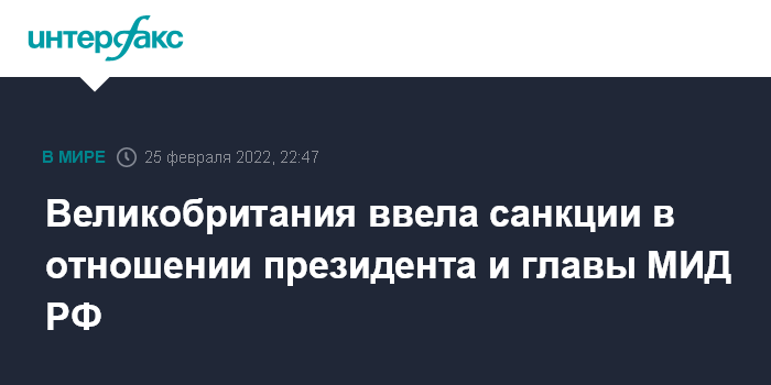 Москва. 25 февраля. INTERFAX.RU - В пятницу власти Великобритании внесли президента РФ Владимира Путина и главу МИД РФ Сергея Лаврова в санкционный список Соединенного Королевства.