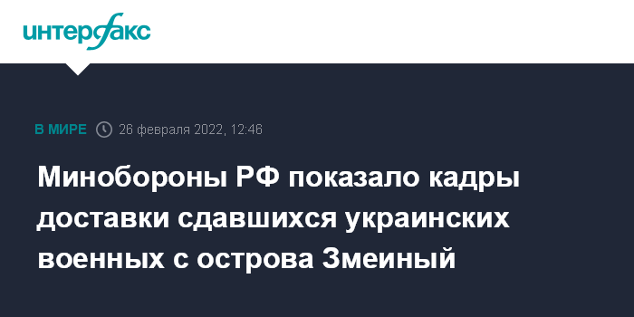 25 февраля официальный представитель Минобороны России генерал-майор Игорь Конашенков сказал, что эта группа украинских военнослужащих сложила оружие в районе острова Змеиный. После прохождения кратковременных юридических процедур военнослужащие ВСУ будут отправлены домой к своим семьям, отметили в ведомстве. Для них был проработан безопасный коридор для вывода из района проведения операции. Заместитель командующего Черноморским флотом по материально-техническому обеспечению Михаил Ясников сказал ранее в субботу, что речь идет об украинских пограничниках.