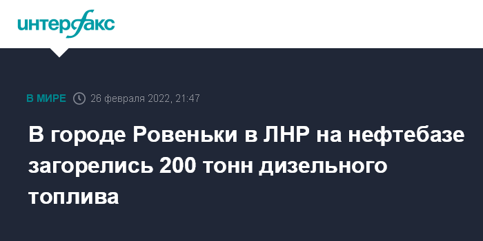 Москва. 26 февраля. INTERFAX.RU - Взрыв произошел на нефтебазе в подконтрольном Луганской народной республике городе Ровеньки, сообщает представительство ЛНР в Совместном центре по контролю и координации режима прекращения огня (СЦКК).