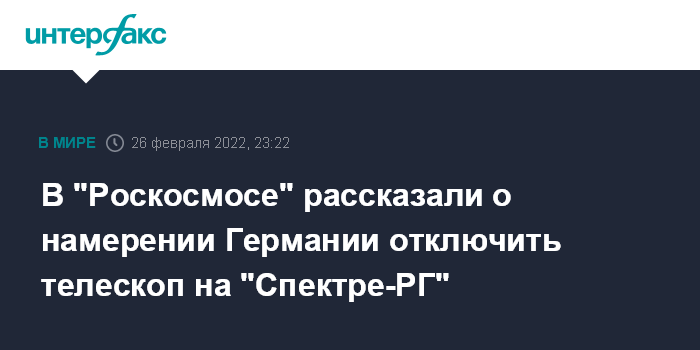 Москва. 26 февраля. INTERFAX.RU - Космическое агентство Германии уведомило "Роскосмос" о намерении отключить свой телескоп на российско-немецкой орбитальной обсерватории "Спектр-РГ", сообщил глава "Роскосмоса" Дмитрий Рогозин.