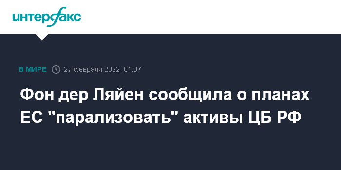 Москва. 27 февраля. INTERFAX.RU - Глава Еврокомиссии Урсула фон дер Ляйен сообщила, что предложит лидерам ЕС заморозить активы ЦБ РФ.