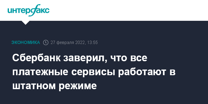 Москва. 27 февраля. INTERFAX.RU - Сбербанк по состоянию на 27 февраля 2022 года не видит перебоев при оплате клиентами товаров и услуг как через собственные, так и партнёрские платежные сервисы. Все они работают в штатном режиме, поясняетсяв сообщении Сбербанка.