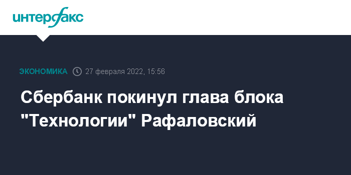 Москва. 27 февраля. INTERFAX.RU - Исполнительный вице-президент, главный технический директор, руководитель блока "Технологии" Сбербанка Давид Рафаловский покинул кредитную организацию, сообщил "Интерфаксу" источник на финансовом рынке.