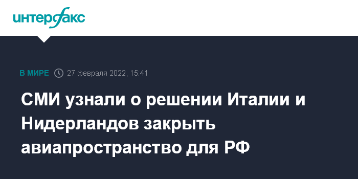 Москва. 27 февраля. INTERFAX.RU - Италия и Нидерланды вслед за рядом других европейских стран объявили о решении закрыть свое воздушное пространство для российских самолетов, сообщили западные СМИ.