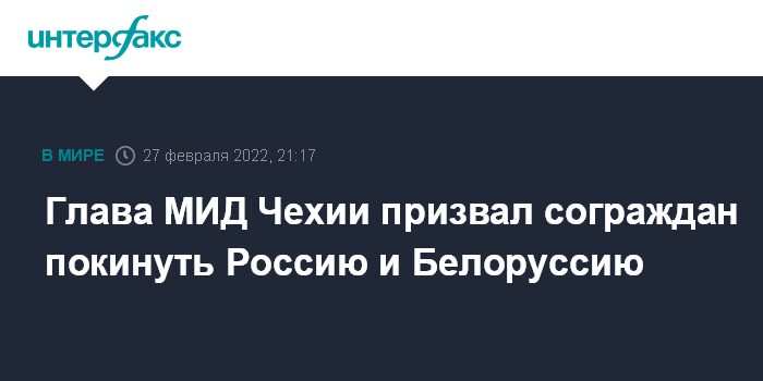 "Мы ужесточаем рекомендации по путешествиям в Россию и Белоруссию. Мы призываем граждан Чехии в России и Белоруссии вернуться в страну", - заявил министр внутренних дел Чехии на пресс-конференции в воскресенье после заседания кризисного штаба МИД страны. Липавского цитирует один из крупнейших новостных порталов Чехии novinky.cz.